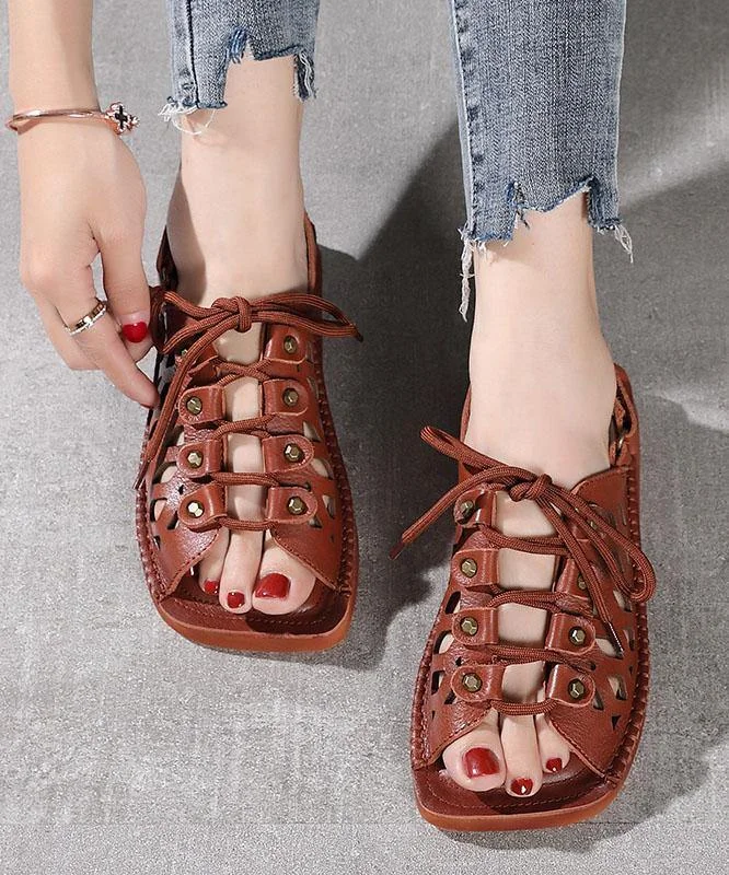 2021 Chocolate Lace Up Flat Sandals Cowhide Leather