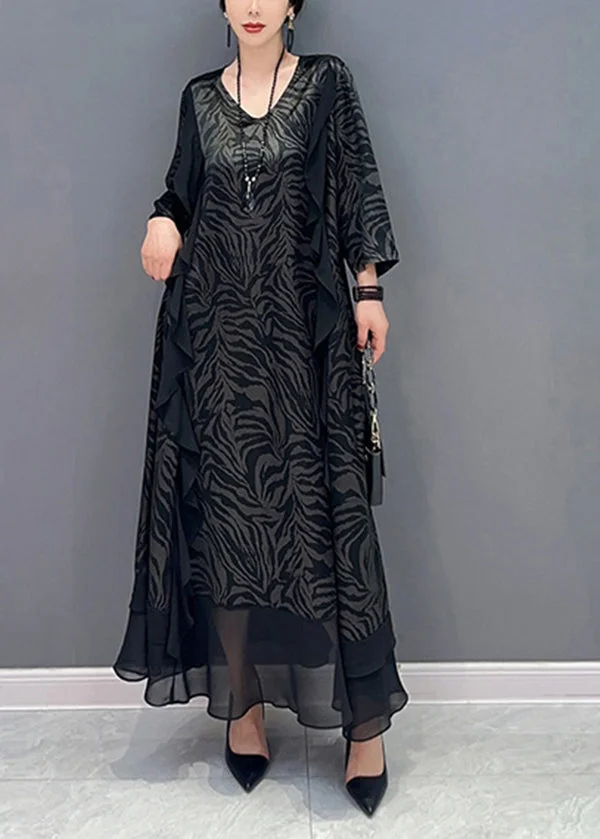 Black Patchwork Silk A Line Dress Ruffles Zebra Pattern Summer Fabric: Chiffon Size & Fit: Fit: This garment fits true to size. Length: Size L measures 40.95"from shoulder to hem Bust: Great for any cup size. Waist: Loose Fit. Comfortable room throughout midsection. Hip: Loose Fit - room for hips. Hand Wash Cold.