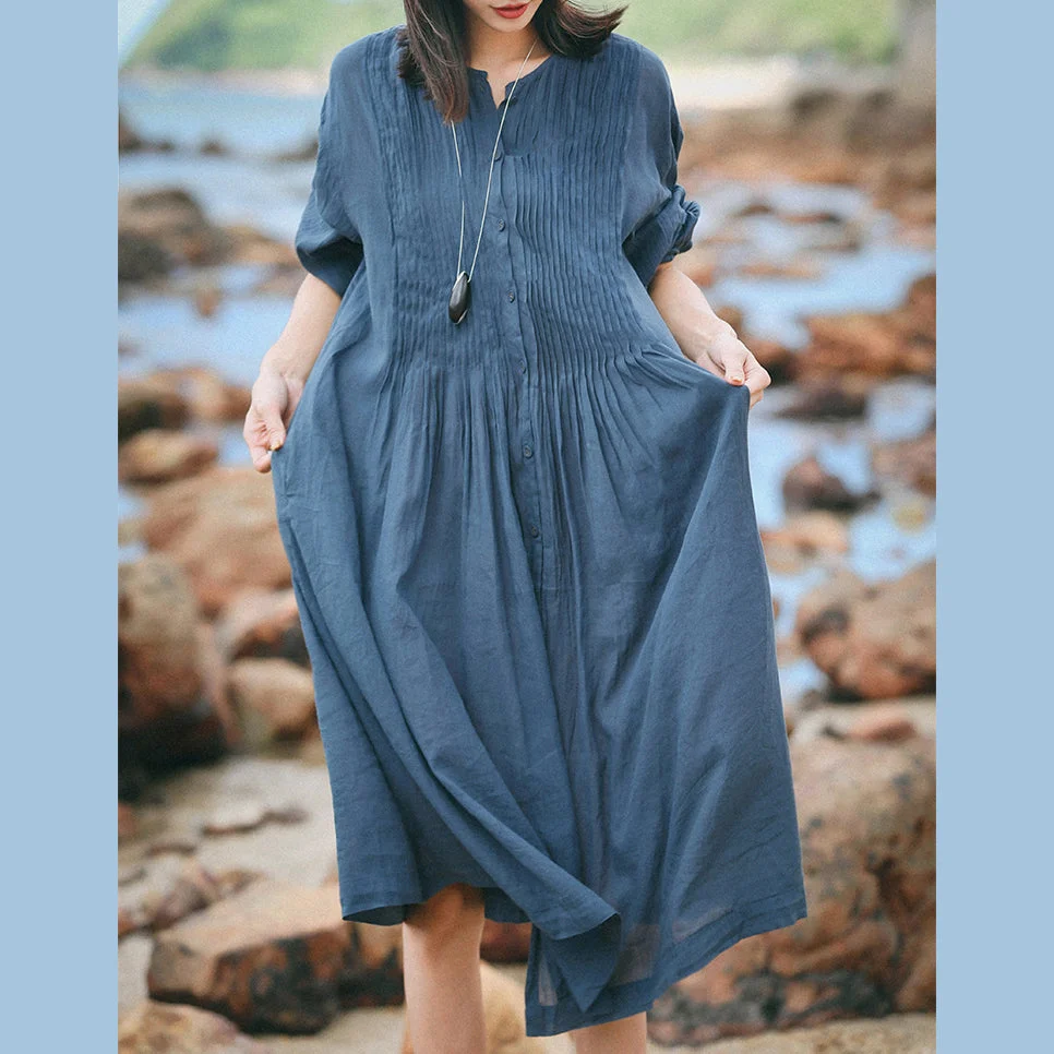 boutique blue gray linen caftans Loose fitting O neck linen clothing dress fine Three Quarter sleeve large hem dresses
