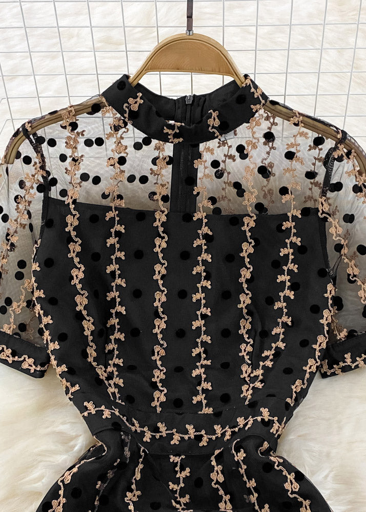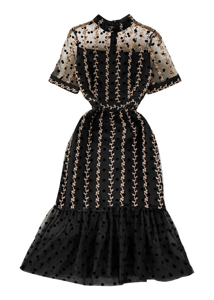 Chic Black O-Neck Dot Ruffled Tunic Tulle Long Fishtail Dress Short Sleeve Fabric: Tulle Size & Fit: Fit: This garment fits true to size. Length: Size S measures 43.68"from shoulder to hem Bust: Great for any cup size. Waist: Loose Fit. Comfortable room throughout midsection. Hip: Loose Fit - room for hips. Hand Wash Cold.