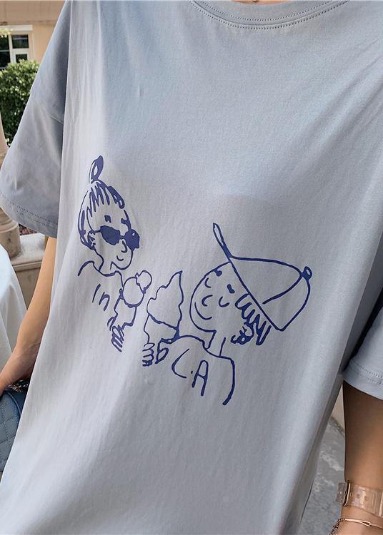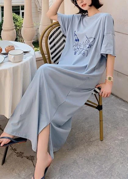 DIY blue o neck cotton tunic dress side open Plus Size Dresses