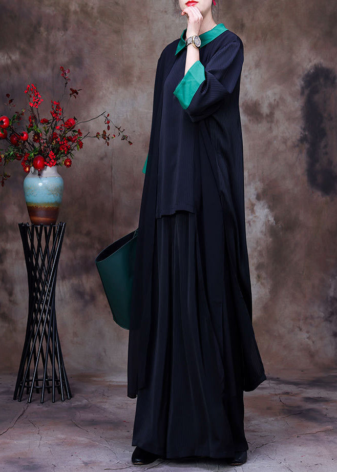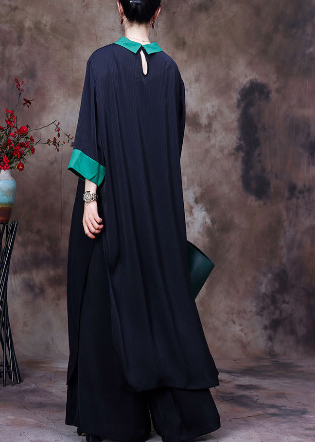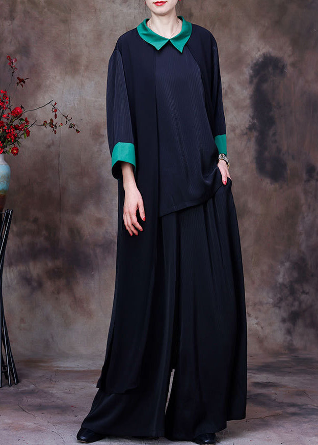 Elegant Black Patchwork Green Peter Pan Collar Low High Design Chiffon Long Shirt And Wide Leg Pant Two Pieces Set Summer Fabric: Chiffon Size & Fit: Fit: This garment fits true to size. Length: Size 2XL measures 44.07"from shoulder to hem Bust: Great for any cup size. Waist: Loose Fit. Comfortable room throughout midsection. Hip: Loose Fit - room for hips. Hand Wash Cold.