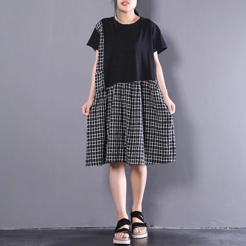 Elegant cotton shift dresses oversized Short Sleeve Plaid Summer Round Neck Black Dress