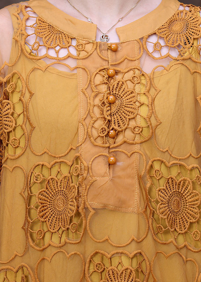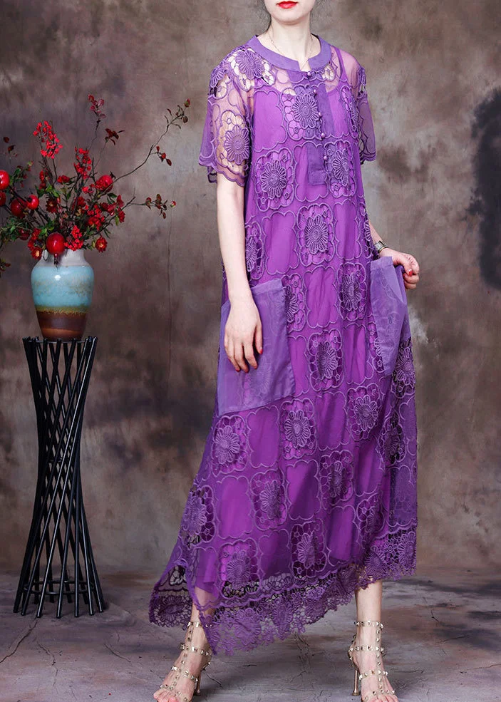 Fashion Purple O-Neck Big Pockets Hollow Out Lace Dress And Spaghetti Strap Dress Two Piece Set Short Sleeve Fabric: Lace Size & Fit: Fit: This garment fits true to size. Length: Size L measures 48.36"from shoulder to hem Bust: Great for any cup size. Waist: Loose Fit. Comfortable room throughout midsection. Hip: Loose Fit - room for hips. Hand Wash Cold.