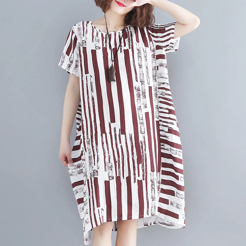 fashion red pure cotton blended dress plus size holiday dresses women short sleeve Geometric O neck asymmetric cotton blended clothing