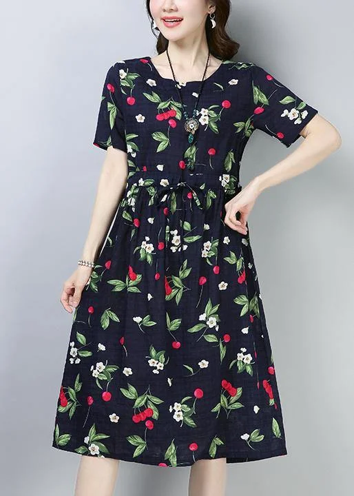 Loose navy prints cotton linen tunic dress drawstring loose summer Dress