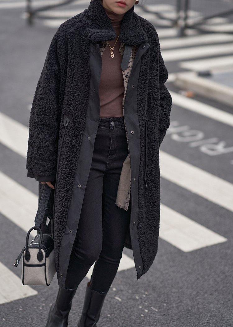 Organic stand collar drawstring Plus Size tunic coat black Dresses outwear