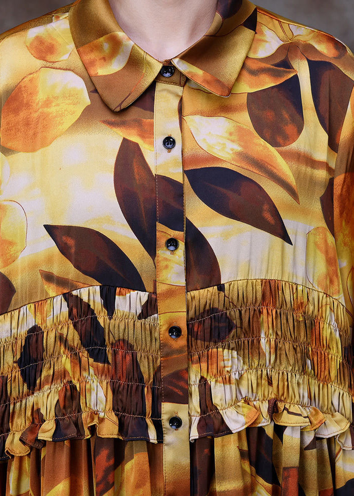 Plus Size Yellow Peter Pan Collar Print Wrinkled Silk Long Shirt Dress Half Sleeve Fabric: Silk blended Size & Fit: Fit: This garment fits true to size. Length: Size 2XL measures 47.19"from shoulder to hem Bust: Great for any cup size. Waist: Loose Fit. Comfortable room throughout midsection. Hip: Loose Fit - room for hips. Hand Wash Cold.