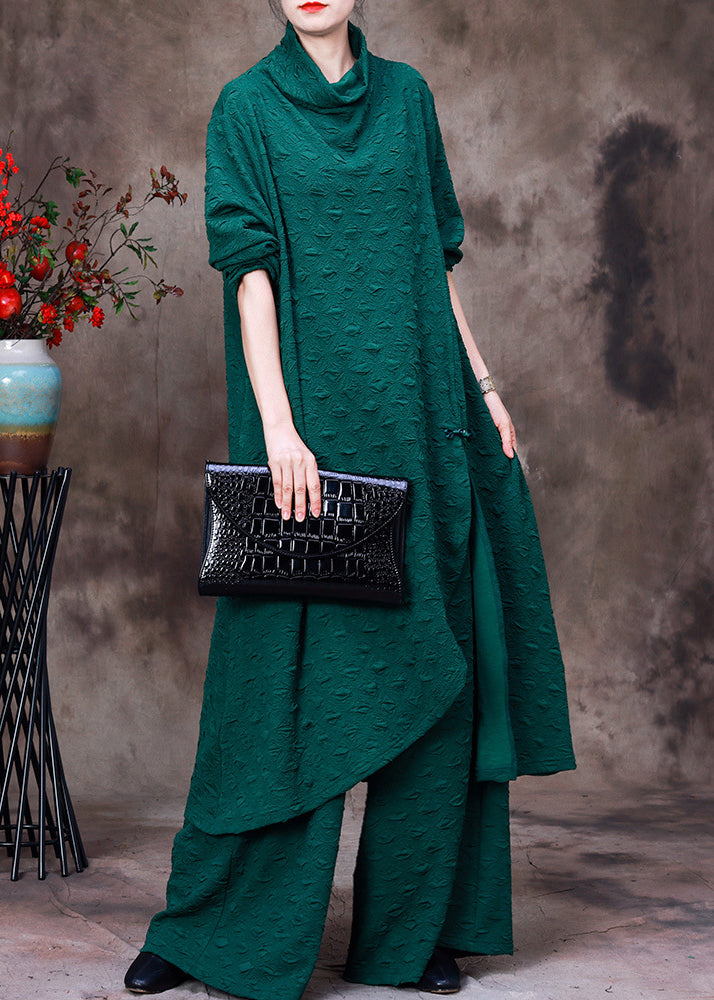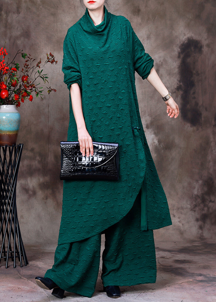 Simple Green Turtleneck Asymmetrical Silk Top And Wide Leg Pants Two Piece Set Fall Fabric: Silk Blended Size & Fit: Fit: This garment fits true to size. Length: Size 2XL measures 39"from shoulder to hem Bust: Great for any cup size. Waist: Loose Fit. Comfortable room throughout midsection. Hip: Loose Fit - room for hips. Hand Wash Cold.