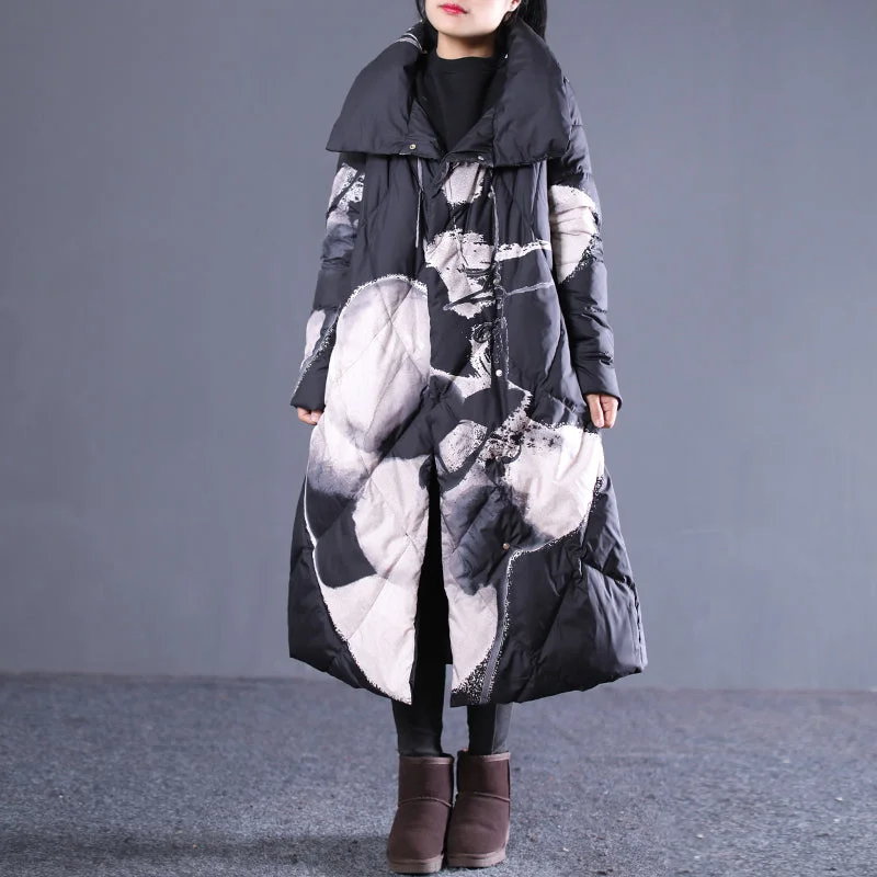 thick black print down jacket plus size stand collar Puffers Jackets pockets zippered long down coats