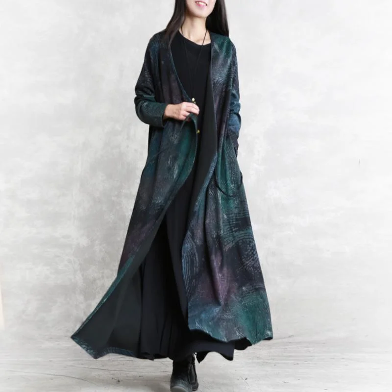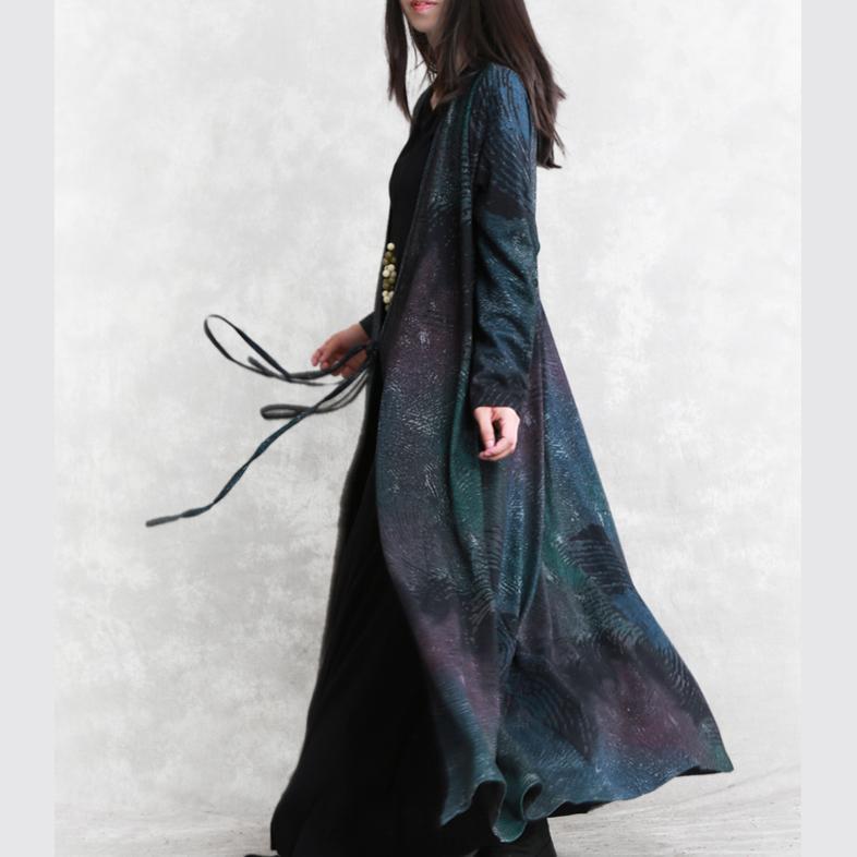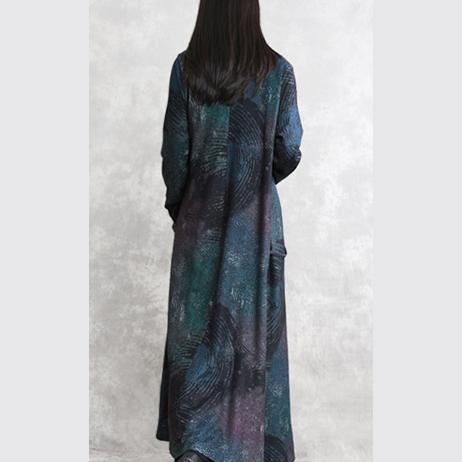 fine blue print fall dress trendy plus size v neck tie waist tunic caftans Fine long sleeve pockets maxi dresses
