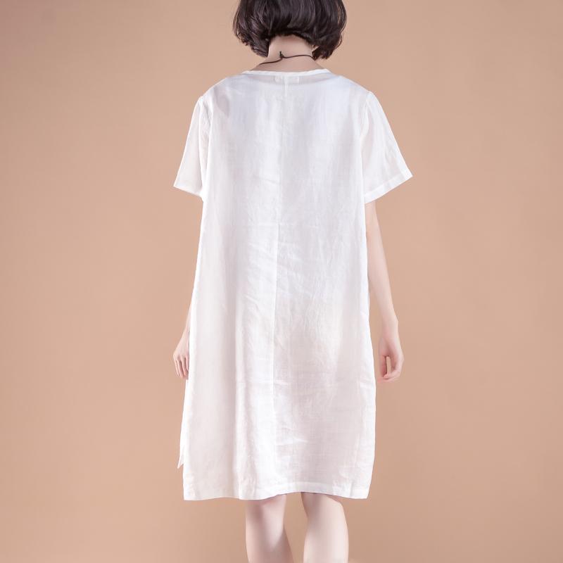 top quality linen cotton dress oversize High-low Hem Summer Short Sleeve Pockets slit White Dress