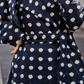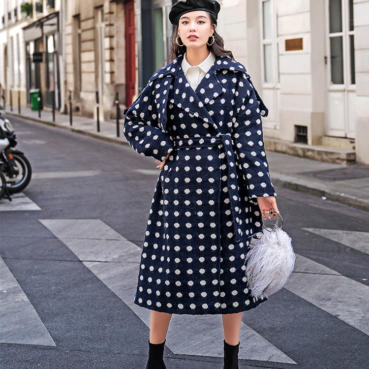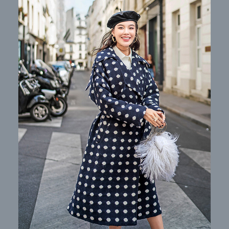 fine navy dotted coat oversize Notched trench coat 2018 tie waist wool jackets
