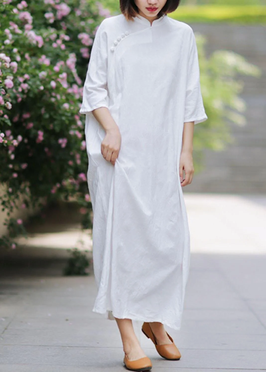 Unique stand collar half sleeve linen summerLong Shirts Tunic dress white Dress