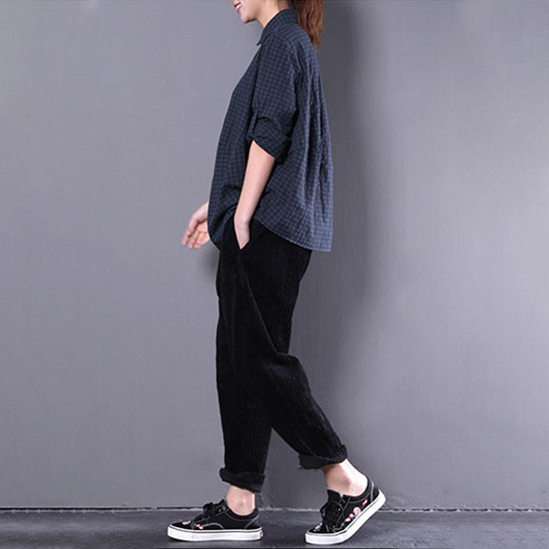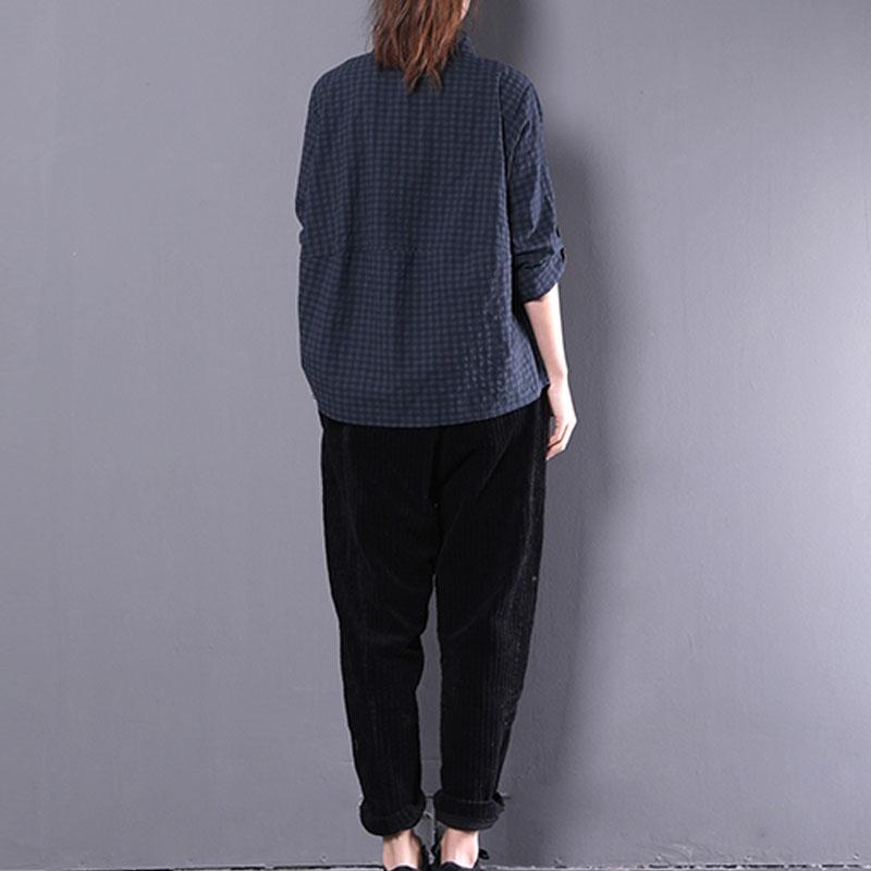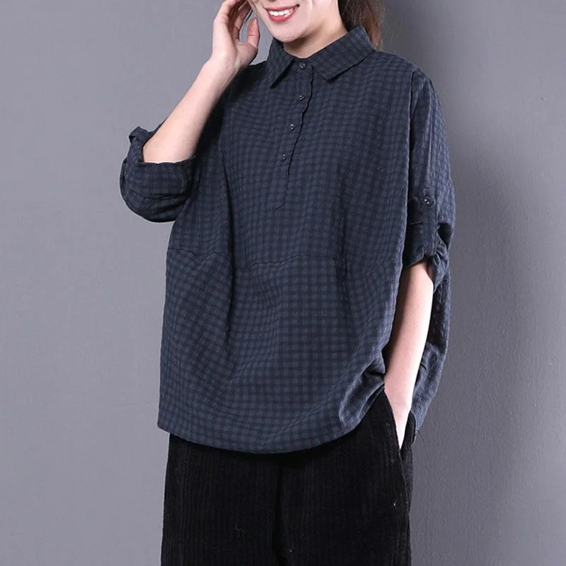 vintage cotton blended tops oversized casual women polo Collar Long sleeve green plaid shirt