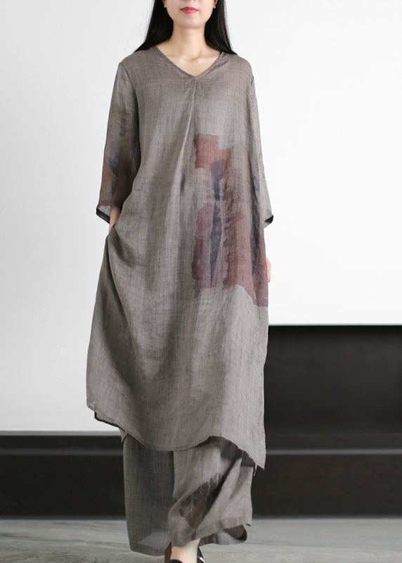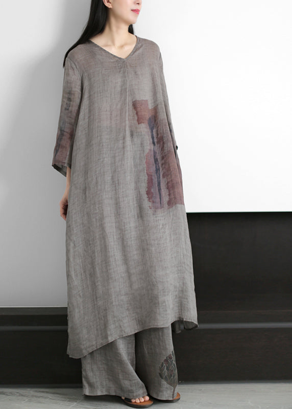Vintage Grey V Neck Print Side Open Linen Dress And Wide Leg Pant Two Pieces Set Summer Fabric: Linen Size & Fit: Fit: This garment fits true to size. Length: Size 2XL measures 43.68"from shoulder to hem Bust: Great for any cup size. Waist: Loose Fit. Comfortable room throughout midsection. Hip: Loose Fit - room for hips. Hand Wash Cold.