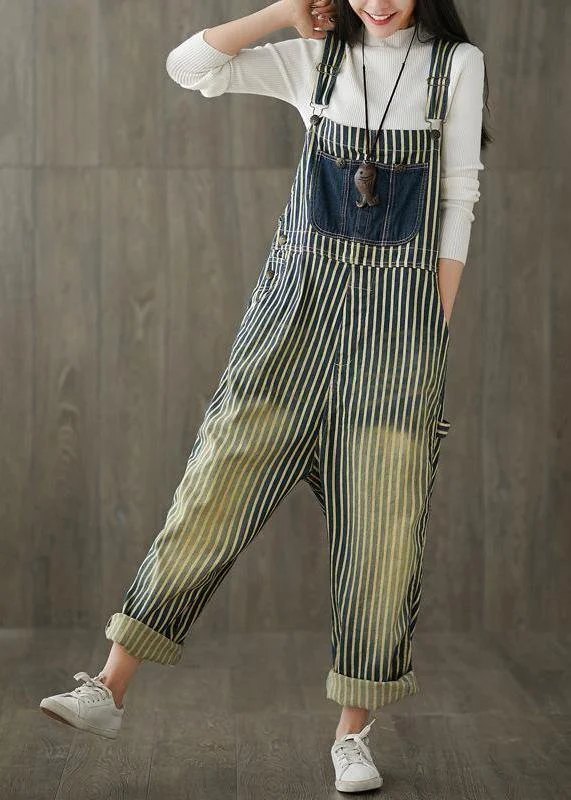 Women Casual Cotton Minimalist Vertical Striped Vintage Full Length Jumpsuits